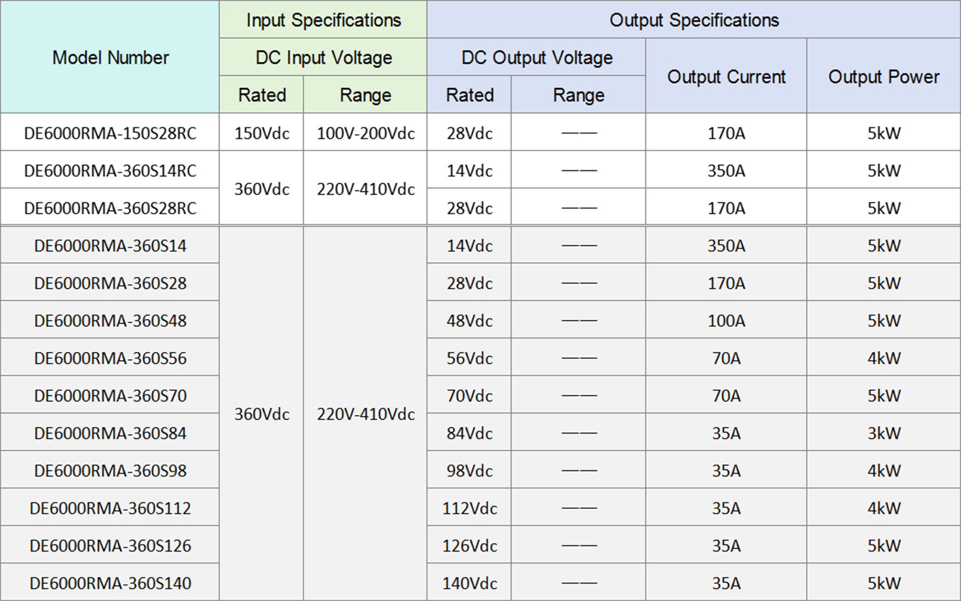 Rated Output Voltage: 14Vdc, 28Vdc, 48Vdc, 56Vdc, 70Vdc, 84Vdc, 98Vdc, 112Vdc, 126Vdc, 140Vdc