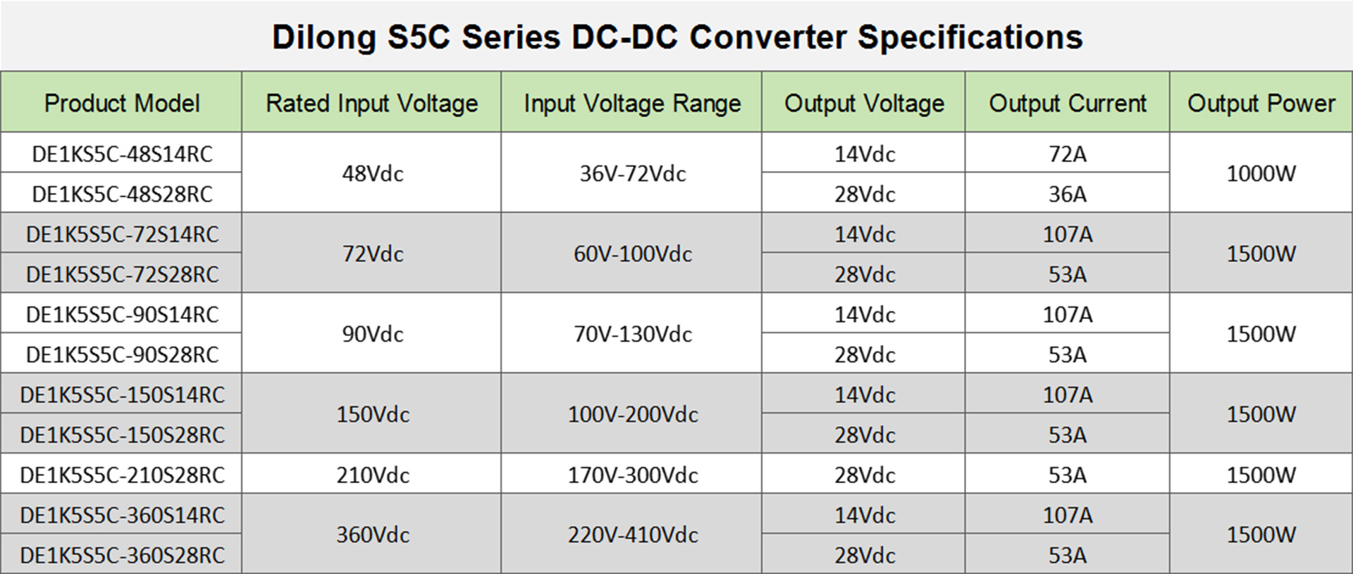 Dilong DE1K5S5C DC to DC converter with features of high efficiency, big power, small volume and reliable working method, adopting advanced pulse width modulation technology.
