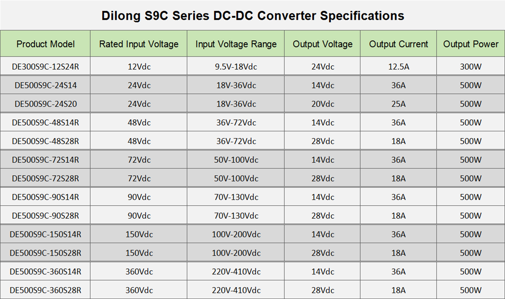 Input Voltage Range: 9.5V~18Vdc, 18V~36Vdc, 36V~72Vdc, 50V~100Vdc, 70V~130Vdc, 100V~200Vdc, 220V~410Vdc